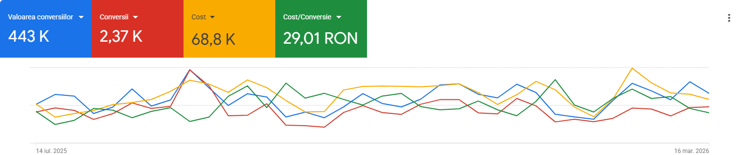 Am preluat contul de Google Ads și am restructurat campaniile. Am corectat și un setup greșit de urmărire a conversiilor care raporta valori incorecte și am recalibrat totul în jurul datelor reale. Rezultat: 2.370 de conversii la un cost de 29,03 RON per conversie, pe o perioadă de 8 luni.