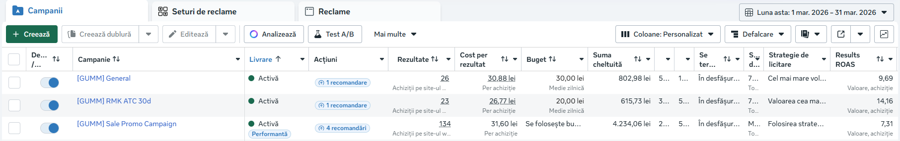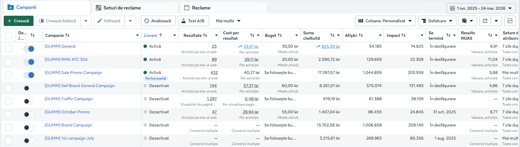 Am rulat campanii de prospectare, campanii de brand și remarketing segmentat pentru coșurile abandonate și clienții care vizitaseră produsele fără să cumpere. Cel mai performant set de remarketing a ajuns la un ROAS de 14,16. Media reală pe cont, după ce am oprit campaniile care nu performau: 8-9 ROAS.