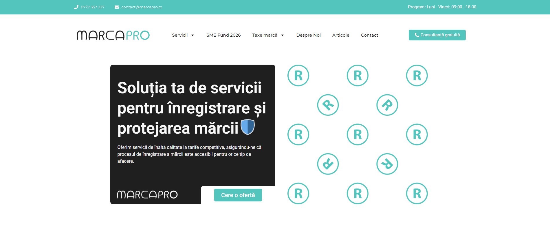 MarcaPRO este un cabinet specializat în înregistrarea mărcilor pentru companii și antreprenori. Consultanță, depunere dosare, urmărire proceduri la OSIM, EUIPO și WIPO. Un serviciu de nișă, cu cerere reală, dar cu o prezență digitală care nu reflecta deloc calitatea serviciului.